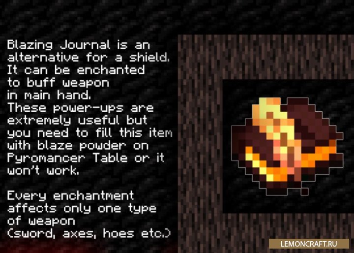 Мод на негорючее дерево Pyromancer добавляет в игру новый вид древесины, которые будет невозможно поджечь, но можно растворить в воде. Так же будет добавлено несколько вариантов мощной булавы, а также специальная книга, которую можно зачаровать, после чего, находясь в левой руке игрока, она будет усилять оружие эффектами.