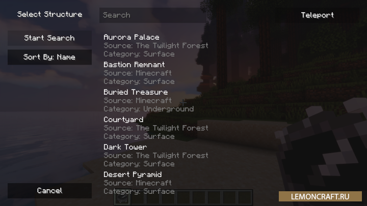 Мод на компас исследователя Explorer's Compass добавляет в игру особый компас, который поможет вам найти сгенерированные в мире структуры. В меню мода вам нужно выбрать нужную вам структуру и вы увидите ее координаты и расстояние, которое до нее осталось.