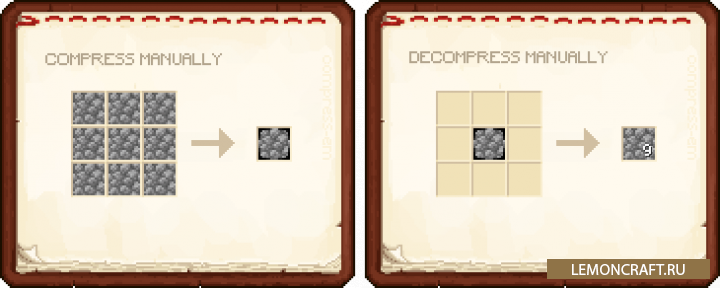 Мод на сжатие блоков и предметов Compress 'em подойдет для тех, кому постоянно не хватает места в сундуках для хранения, а строить большие склады уже не хватает места. Мод добавляет новый инструмент с помощью которого вы сможете сжимать большое количество предметов в один (вплоть до 60 000). В результате у вас всегда будет возможность хранить столько предметов и блоков, сколько вам нужно.