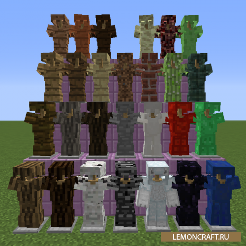 После установки данной модификации вам станут доступны уникальные сеты брони из различных ванильных блоков (вплоть до снега).
